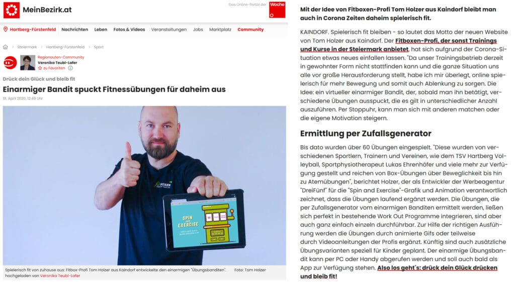 Tom Holzer, Obmann vom Verein Fitnetz, Dipl. Atemtrainer, staatl. geprüfter Instruktor und hauptberuflich Entwickler, baut den „einarmigen Übungsbanditen“ – ein Tool, das zufällig Übungen für seine Mitglieder beim Fitboxen-Training ausspuckt, nachdem das Training während der Pandemie nicht stattfinden konnte.