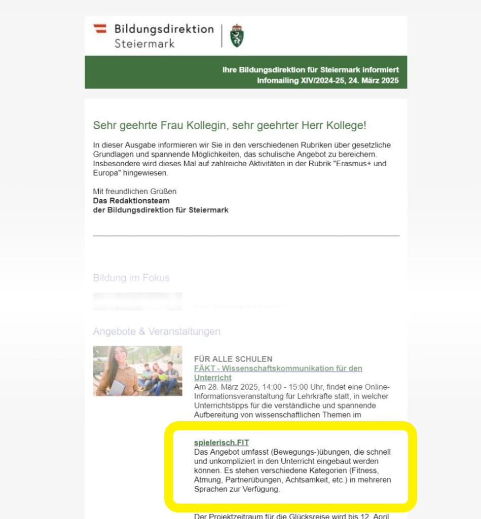 Die Bildungsdirektion Steiermark nimmt spielerisch.fit in den offiziellen Newsletter an alle steirischen Schulen auf.